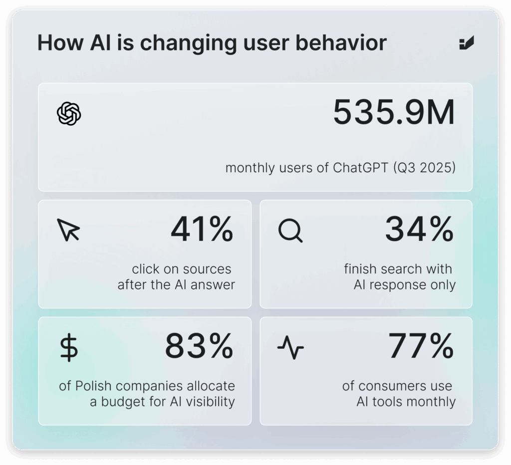 - 83% of Polish companies have already allocated or plan to allocate budgets for AI visibility (Insightland, 2025).