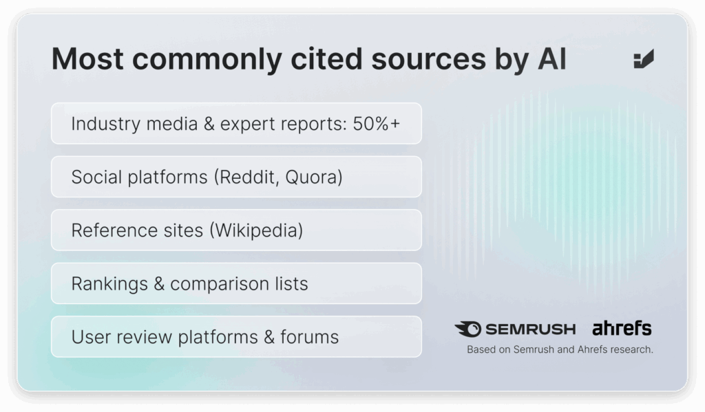 - Industry media and expert reports – over 50% of AI-cited sources come from high-authority domains (Semrush, 2025).