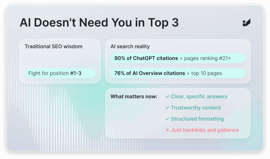 Research from Semrush reveals that when ChatGPT searches cites webpages, approximately 90% of cited pages rank in traditional organic search positions 21 or lower. This means businesses don’t need top-3 rankings to gain AI visibility – they need content that provides clear, specific, trustworthy answers to user questions.
