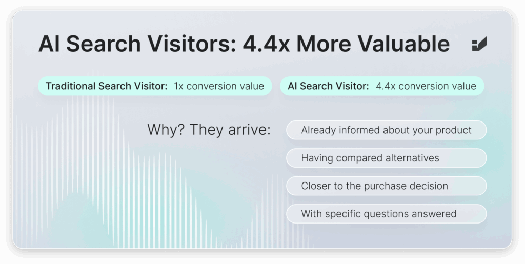 But focusing only on declining click volumes misses the real opportunity. The most compelling statistic from Semrush’s AI search study reveals that the average LLM visitor is worth 4.4 times more than the average traditional organic search visitor, based on conversion rates.