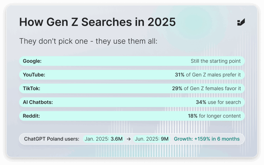 Gen Z’s behavior crystallizes why this matters for the long term. With 9 million ChatGPT users in Poland alone – growing 159% in six months – and 34% of Gen Z using AI chatbots for search, the next generation of consumers is already comfortable with AI-mediated discovery. Businesses optimizing for this reality today build advantages that compound as these users age and their purchasing power increases.