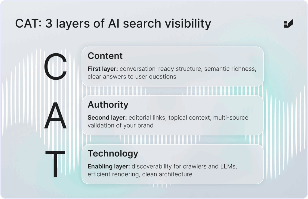 CAT operationalizes the idea that GEO is built on SEO’s core: content relevance, authority signals, and technical health, extended into AI search instead of replaced. Content and Authority are the strategic drivers, but they only translate into GEO results if the Technology layer is optimized so that both traditional crawlers and LLM-focused mechanisms (like LLMs.txt, rendering strategies, log-based crawl diagnostics) can fully access and reuse your site’s information.