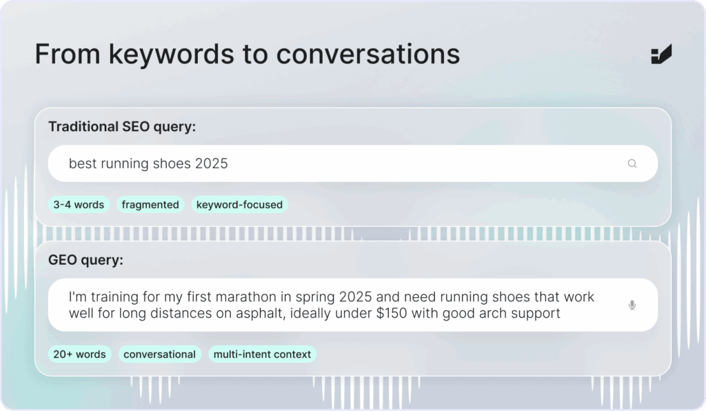 Query patternsShort, fragmented queries (often 3-4 words).Longer, conversational queries (often 20+ words) with multi-intent context.