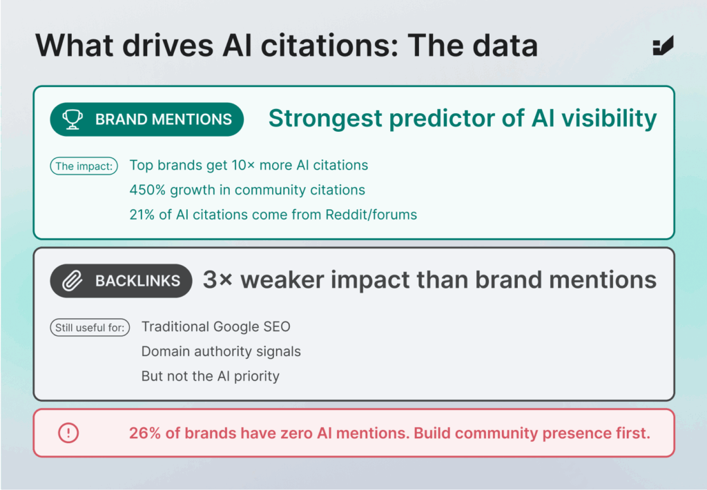 Reality: Brand mentions are the strongest correlate of AI Overview visibility (correlation 0.664), far outweighing backlinks (0.218). AI systems treat brand mentions as signals of authority and trustworthiness. Brands in the top quartile for web mentions average 10× more AI Overview mentions than those in the next quartile. User-generated citations (e.g., Reddit) have grown 450% in three months, now comprising over 21% of AI citations.
