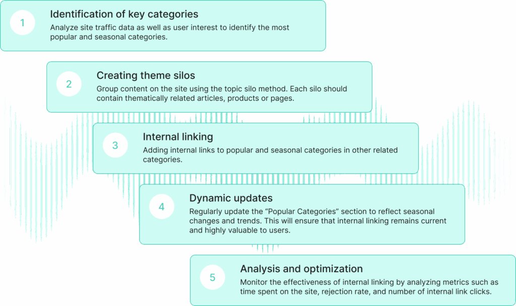 A key component of building topical authority is the proper internal linking within the website. Topic clusters are groups of closely related web pages, linked in a way that reinforces the authority of a specific topic. This process was executed in the following stages:
