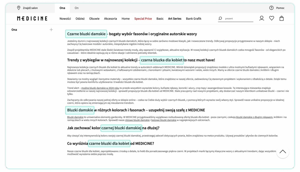 Category pages with color filters were enhanced with optimized content that not only increased their visibility in search results but also better matched specific user intents. Each page was aligned with color-related keywords, allowing precise matching with search queries. For example, pages like “women’s black blouses” or “women’s white blouses” were filled with content describing the products and referencing current trends, styling ideas, and practical advice on wearing clothing in specific colors.