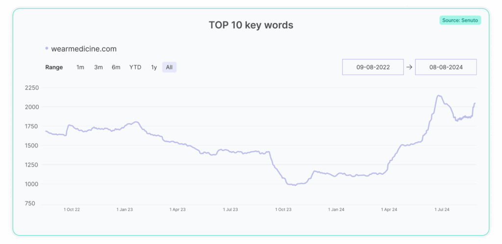 Insightland’s team of experts faced a unique task: wearmedicine.com began to experience a decline in search rankings. The signs were clear-key phrases that once generated valuable traffic were gradually losing ground to competitors. Successive reports highlighted the need for decisive action to improve performance. The preventative work between Insightland and wearmedicine.com laid the groundwork for the results we’re sharing today.