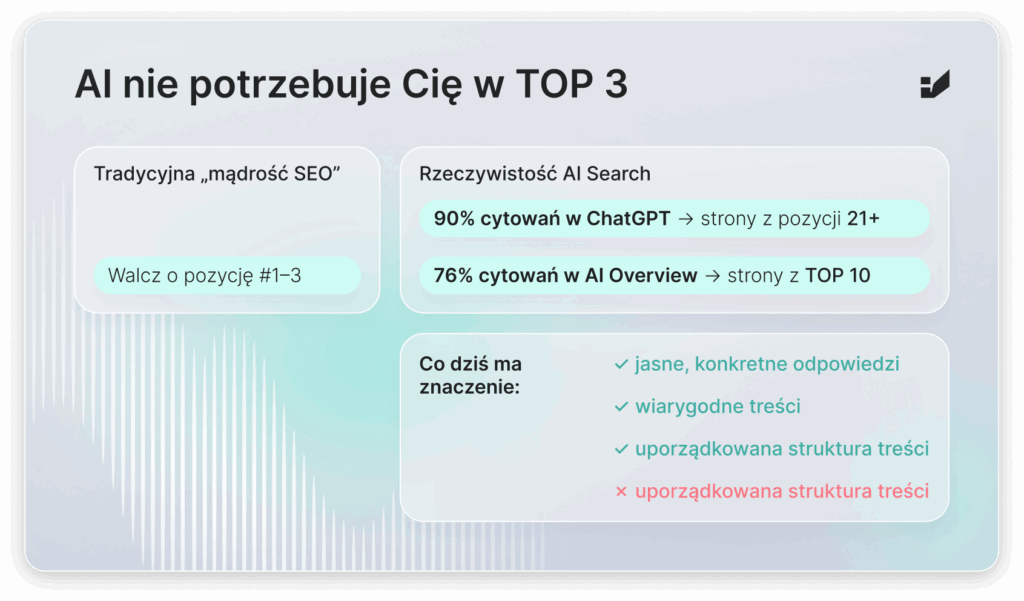 Badania Semrush pokazują, że gdy ChatGPT cytuje strony internetowe, około 90% z nich znajduje się na pozycjach 21 lub poniżej w tradycyjnych wynikach organicznych. Oznacza to, że firmy nie potrzebują pozycji w top 3, aby zyskać widoczność w AI – potrzebują treści dostarczających jasnych, konkretnych i wiarygodnych odpowiedzi.