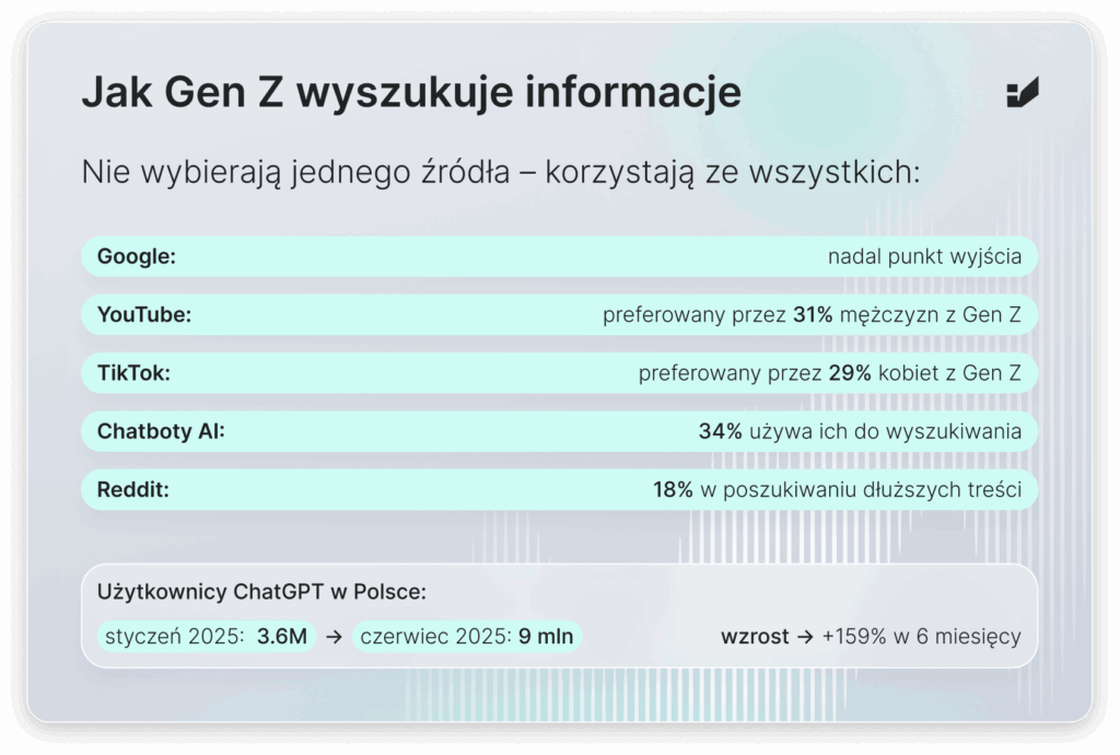 Według naszego badania przeprowadzonego w grupie ponad 500 użytkowników z pokolenia Z, wśród mężczyzn z GenZ 31% preferuje YouTube jako alternatywę dla Google, natomiast 29% kobiet z GenZ wybiera TikTok. To podejście wieloplatformowe jest czymś nowym: GenZ nie polega na jednym źródle odpowiedzi. Weryfikuje informacje równolegle w tradycyjnych wyszukiwarkach, mediach społecznościowych i chatbotach AI.