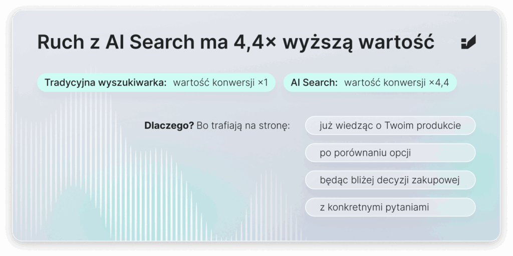 Ta znacząca różnica zmienia równanie wartości. Użytkownicy pochodzący z AI search konwertują lepiej, ponieważ LLM dostarczają im szczegółowych informacji jeszcze przed wejściem na stronę. W momencie kliknięcia porównali już opcje, ocenili alternatywy i często poznali propozycję wartości marki. Trafiają na stronę lepiej poinformowani i bliżej decyzji zakupowej.