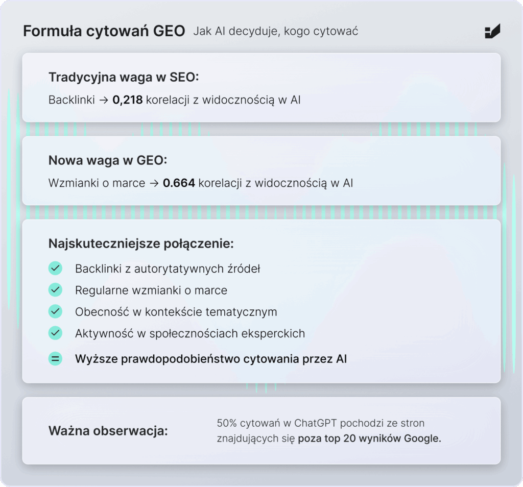Czy linki wciąż są kluczowe dla GEO? Badania sugerują, że tak, choć ich funkcja się zmieniła. Wzmianki o marce zyskują znaczenie, zwłaszcza gdy są analizowane razem z kontekstem, w którym się pojawiają.