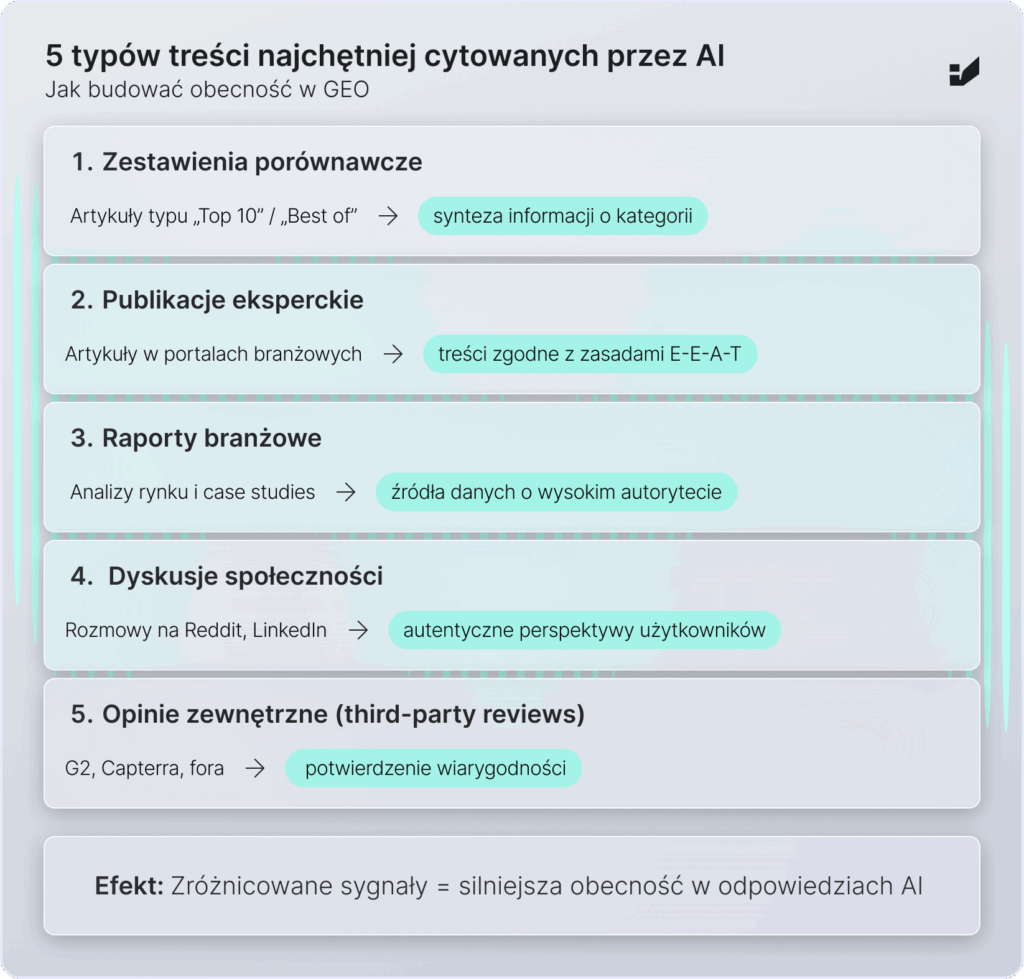 W Generative Engine Optimization linki i wzmianki działają wtedy, gdy budują spójną narrację marki w zaufanych źródłach. Analiza treści cytowanych przez AI ujawnia preferowane typy contentu: