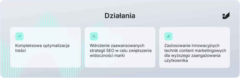 Przeanalizowaliśmy istniejące treści i zidentyfikowaliśmy kluczowe frazy oraz tematy istotne dla odbiorców. Wdrożyliśmy model silo, porządkując treści w spójne grupy tematyczne, co poprawiło ich strukturę i widoczność w wyszukiwarkach. Skupiliśmy się także na tworzeniu materiałów dopasowanych do aktualnych trendów i sezonowości, aby skuteczniej przyciągać i angażować użytkowników.