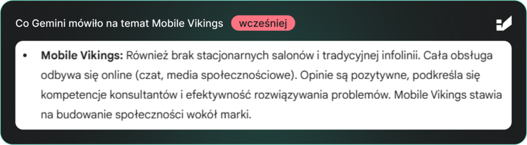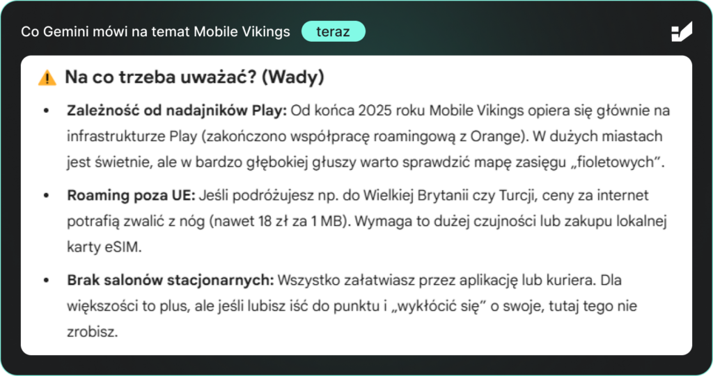 Analiza zapytań brandowych, non-brandowych i porównawczych (np. „Mobile Vikings czy nju mobile – kto ma tańszą ofertę?”) ujawniła poważny problem: Gemini systematycznie wskazywało brak tradycyjnej infolinii jako główną słabość Mobile Vikings, sugerując, że cała obsługa klienta odbywa się wyłącznie online.