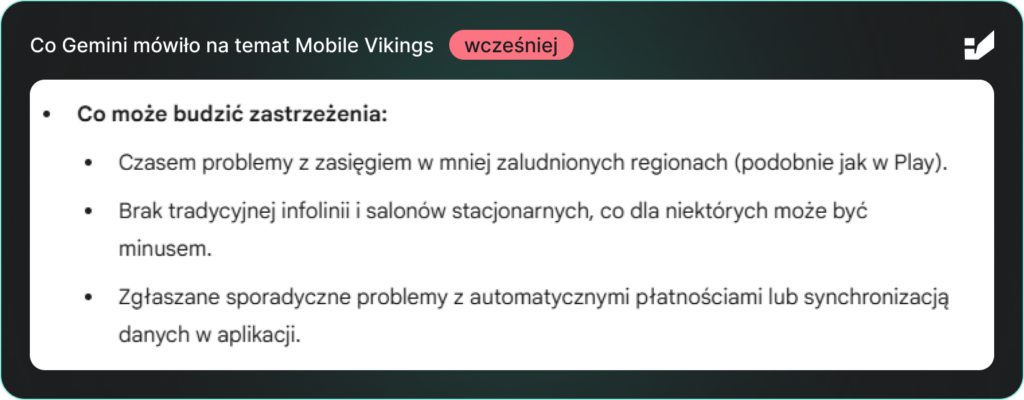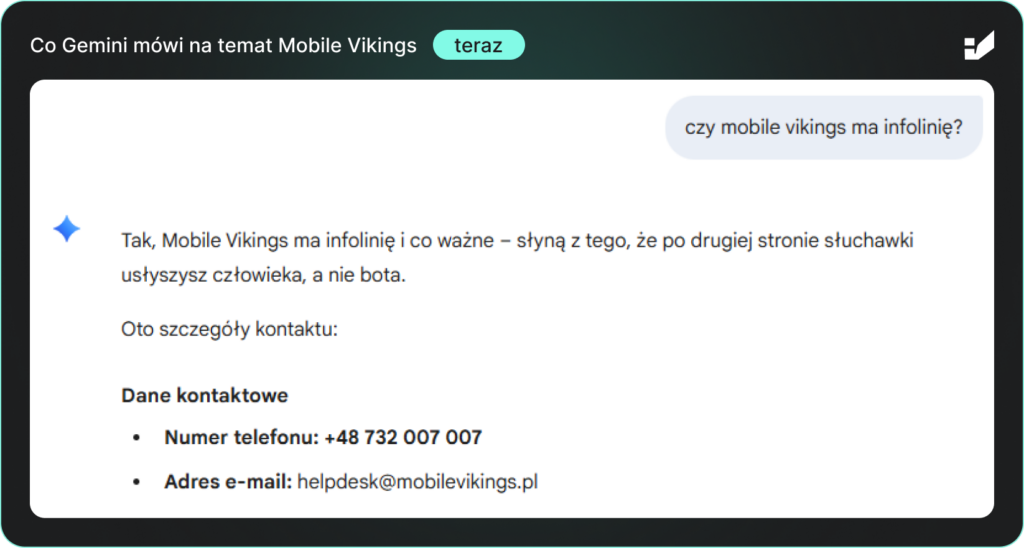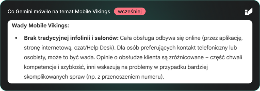 Ta informacja była całkowicie błędna – Mobile Vikings posiada sprawnie działającą infolinię. Mimo to, dla użytkowników weryfikujących markę w LLM-ach, brak wsparcia telefonicznego mógł stanowić realną barierę przed skorzystaniem z oferty. Błąd pojawiał się konsekwentnie w odpowiedziach na zapytania opiniotwórcze i porównawcze – dokładnie tam, gdzie użytkownik podejmuje decyzję.